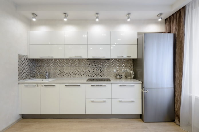 На фото рабочая зона, декорированная мозаикой серебряного оттенка в интерьере кухни.