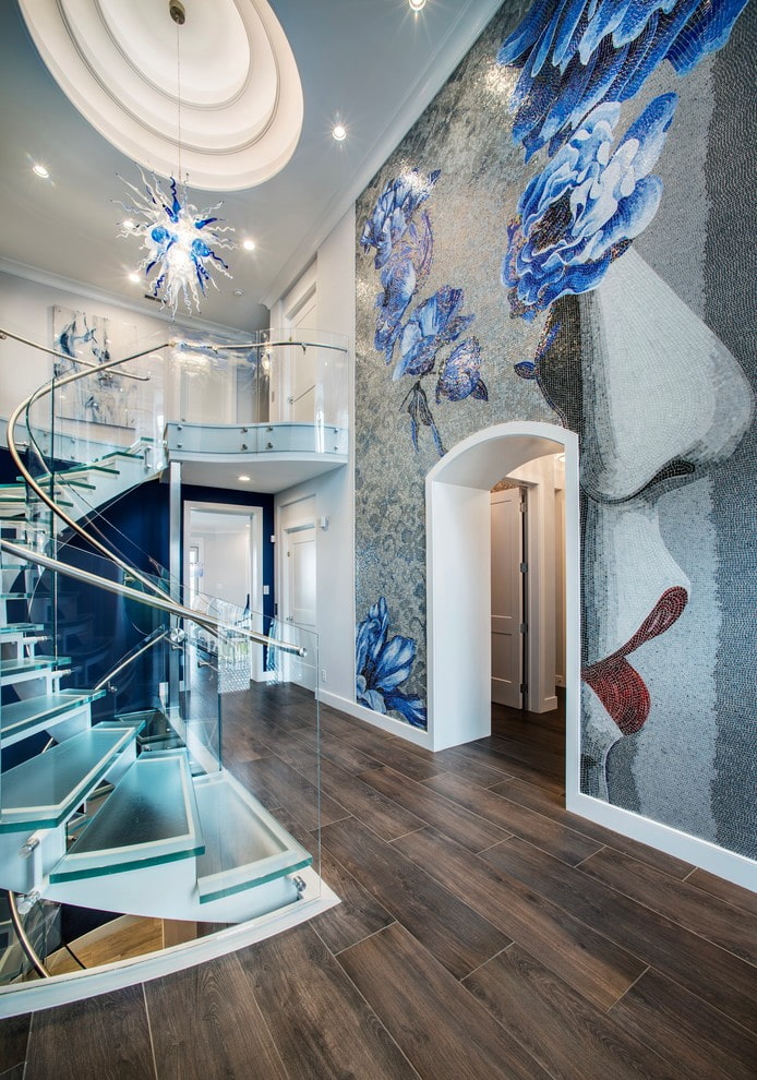 Мозаичная плитка на стенах или на полу будет особенно хорошо смотреться в коридоре. За счет многообразия видов можно воплотить в жизнь самые смелые дизайнерские идеи и тем самым выгодно подчеркнуть общий дизайн, наделяя его статусностью и аристократичностью.