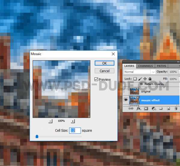 Возвращаемся на слой Эффект Мозаики (Mosaic Effect), чтобы создать эффект пикселей. Идём Фильтр – Оформление – Мозаика (Filter > Pixelate > Mosaic). Установите Размер ячейки (cell size) на 12.