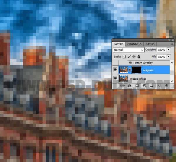 В качестве заключительного штриха, вы можете добавить решётчатый узор к слою Эффект Мозаики (Mosaic Effect). Скачайте решётчатый узор по ссылке в начале этого урока. Далее, к слою Эффект Мозаики (Mosaic Effect), примените стиль слоя Наложение узора (Pattern Overlay). В окне настроек данного стиля слоя, установите Масштаб (scale) на 50%. Если узор не выровнен со слоем, тогда щёлкните по кнопке Привязать к началу координат (Snap to origin).
