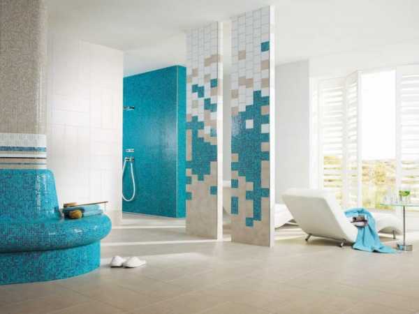 Существует множество вариантов применения в интерьере ванной плитки из мозаики. Ею можно отделать стены и пол в ванной комнате или душевой. Мозаикой можно отделать только часть помещения, создав отдельный большой рисунок из мозаики, например, пейзаж или абстрактные геометрические фигуры, а остальное выложить керамической плиткой. При этом керамическая плитка и мозаика в ванной хорошо сочетаются.