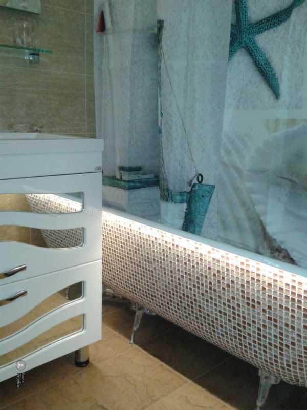 Можно покрыть мозаикой встроенные полки и защитный экран ванной или украсить пространство у раковины. В общем не сложно придумать красивый дизайн ванной с мозаикой и плиткой.