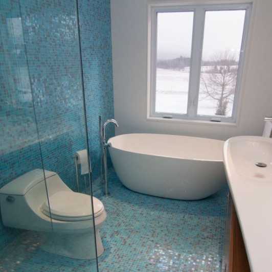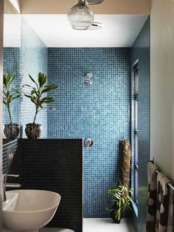 Именно с этого помещения началось массовое использование мелкой плитки в интерьере. Дизайнерам так захотелось альтернативы скучному и приевшемуся кафелю, что стеклянные панно, обладающие такой же прочностью, но более утонченным видом, пришлись по вкусу. Небольшие размеры выгодно гармонируют с привычными тесными комнатами санузлов.