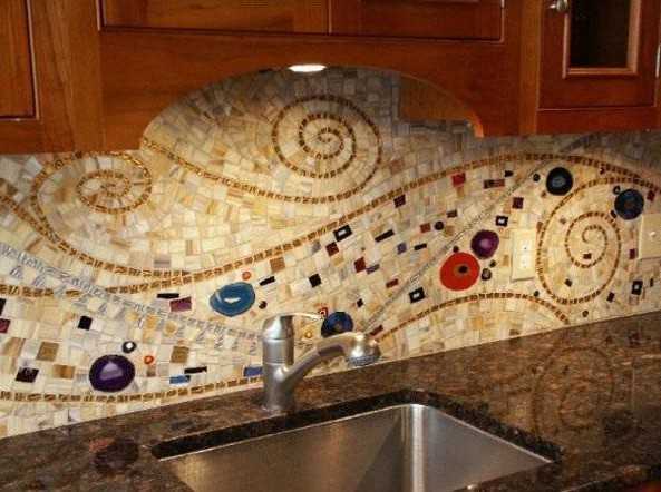 Мозаику на кухне применяют в первую очередь для выкладки защитного фартука. Украшают также пол и стены напротив обеденного стола. Ею можно даже выложить столешницу обеденного или рабочего стола на кухне.
