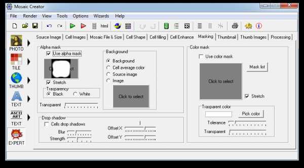 Далее вкладыш Masking. Здесь, для того чтобы края ячейки нашей мозаики были более плавными, с переходами, мы используем альфа-маску. В программе есть куча разных масок, выбор большой, если какая-то не подходит, её можно подредактировать в фотошопе.