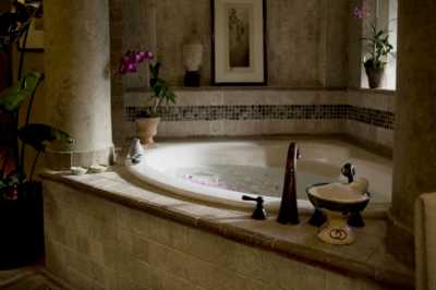Японцы для купания часто используют горячие источники. Поэтому для такого интерьера надо делать подиум и ставить полукруглую или веерообразную джакузи. Широкий подиум и сложные загнутые формы подойдут для классицизма и ампир.