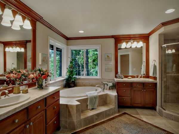 Угловую ванную комнату можно оформить и в традиционном классическом стиле. Такой дизайн более консервативен, однако, он может быть очень изысканным и утонченным.
