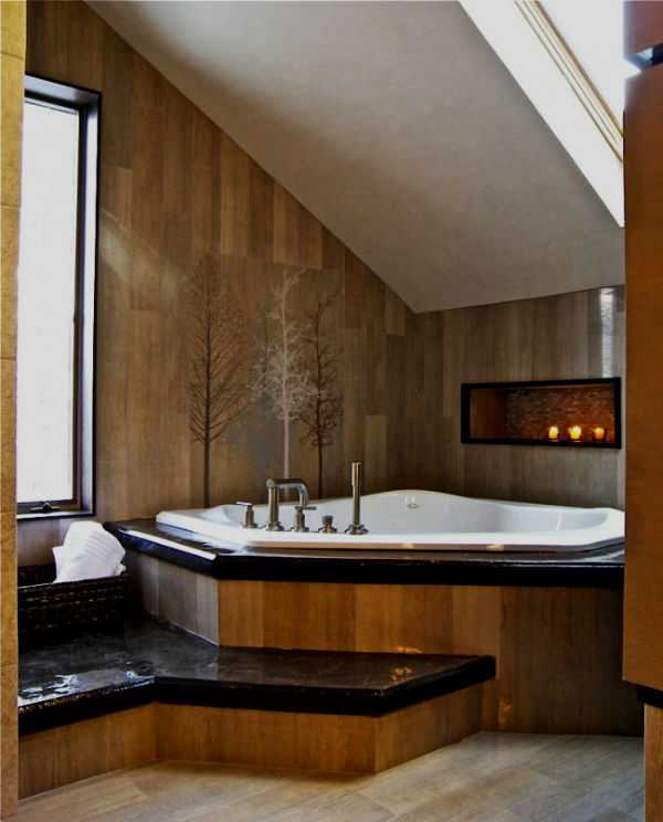 - Экостиль характеризуется близостью к природе. Идеальное решение – обшить угловую ванну деревом.
