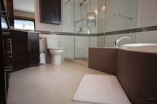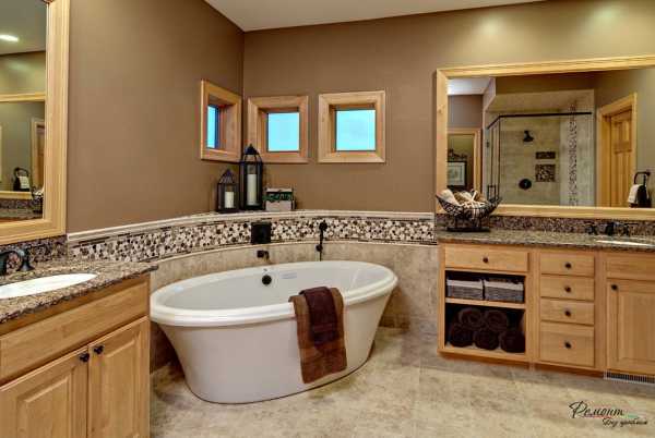 Напольная плитка подойдет коричневого цвета. Специалисты рекомендуют использовать имитацию древесины или темного камня. Угловую ванну и другие сантехнические изделия можно установить стандартного белого или кремового цвета. При этом мебель для ванной должна быть контрастной – лучший вариант деревянные шкафы темного цвета или модули из ДСП, МДФ.