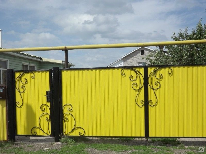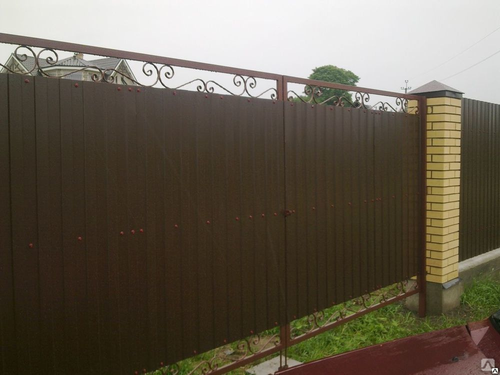 Для создания прочных и в то же время аккуратных на вид ворот используются металлические листы с высотой профиля 8 мм и толщиной 0,6 мм. Такой лист можно увидеть на фото. Сколько именно материала потребуется для конструкции, зависит от индивидуальных замеров.