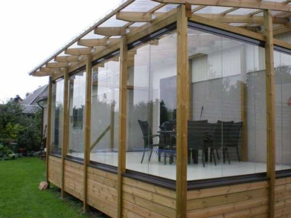 Крытая терраса может быть защищена от ветра с разных сторон, например, закрыта с помощью остекления. Более дешевый вариант специальные пленки, которые могут быть удалены при необходимости. Кроме того, вы можете использовать террасу как уютный зимний сад.