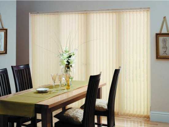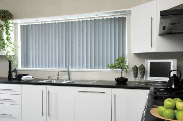 Вертикальные же жалюзи — это своеобразные шторы, у которых планки свисают сверху вниз. Изготавливаются они лишь из стекловолокна или ткани. Открываются как обычные шторы (в одну, другую или обе стороны). К преимуществам данного вида жалюзи можно отнести их презентабельный внешний вид. К тому же, они отличаются хорошим качеством и долговечностью. Вертикальные жалюзи на кухню вы можете посмотреть ниже в следующих фото.