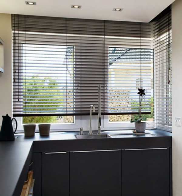 На фото интерьер кухни и горизонтальные ламели черного цвета на окне.