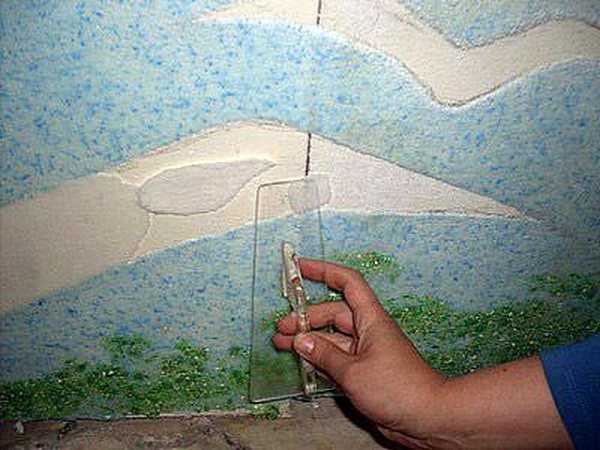 Обои наносят шпателем или пластиковой гладилкой. Удобнее нанести часть смеси на стену просто рукой и плотно прижать, а затем распределить её по поверхности при помощи гладилки.
