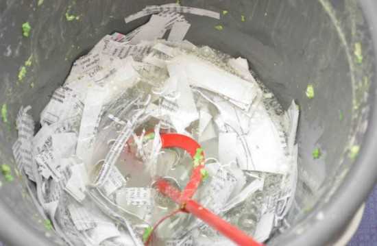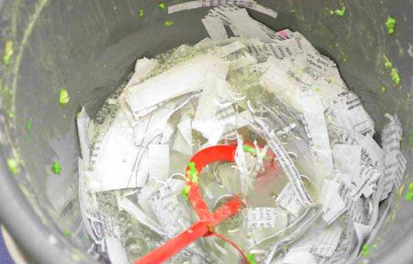 — Выждав нужное время до максимального размокания, бумагу с водой замешивают с помощью электродрели с насадкой-миксером до достижения однородной массы.