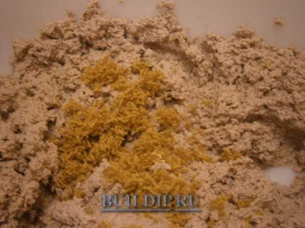 — Затем, в полученную смесь добавляют краситель и клей, а затем продолжают замешивание.
