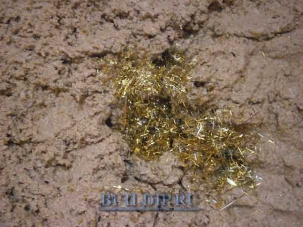 Для декоративных добавок, как и в первом варианте, могут быть использованы те же компоненты – мелкая крошка различных минералов, блестки, слюда и др. Их применение будет зависеть от того, какой эффект планируется получить. Однако, нужно сразу предупредить об умеренности — не стоит использовать сразу несколько добавок, так как это может только все испортить.