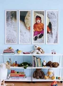 Детская комната – это одно из самых благодатных мест для размещения. Здесь будут уместно смотреться фотографий ребенка, например показывающие то, как он растет и изменяется от года в год или коллаж из картинок с персонажами из мультиков. Можно также разместить его собственные рисунки. Экспозицию следует выдержать в одном стиле и цвете. Фотографии желательно размещать асимметрично либо по возрастанию. Так как симметричное размещение симметрии и от всего остального интерьера комнаты, а для детской это будет как минимум неуместным. Интересной идеей будет создание генеалогическое дерево вашей семьи.
