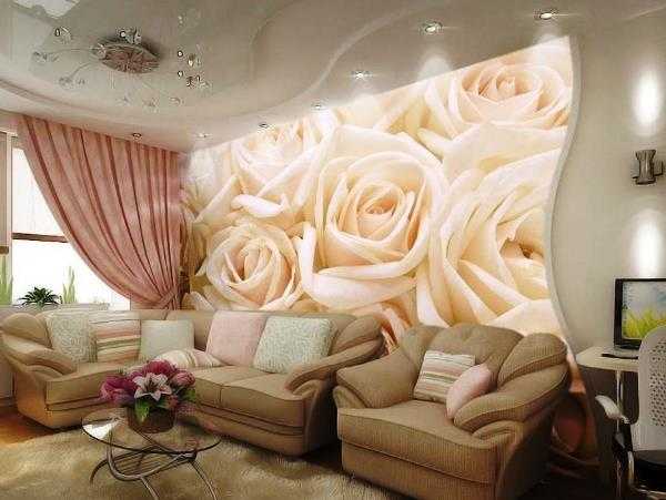 Идеальным вариантом для гостиной являются фотообои 3д для стен, на которых изображены цветы.
