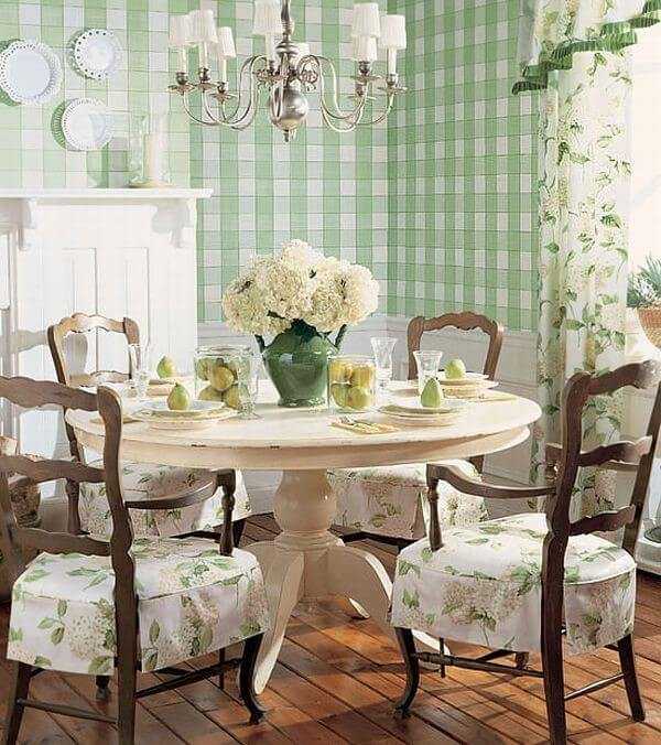 На стол постелите скатерть из льна и положите яркие салфетки. На окно повесьте занавески с цветами. Не забудьте про подушки и декоративные чехлы на стулья.