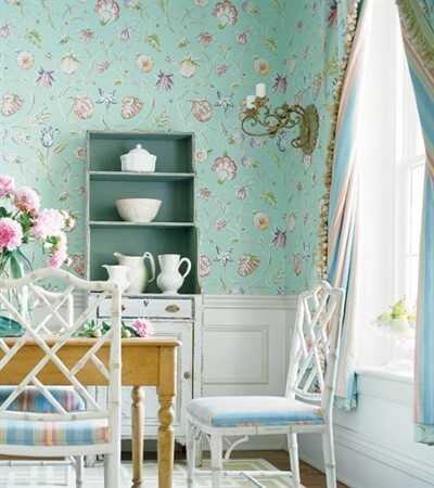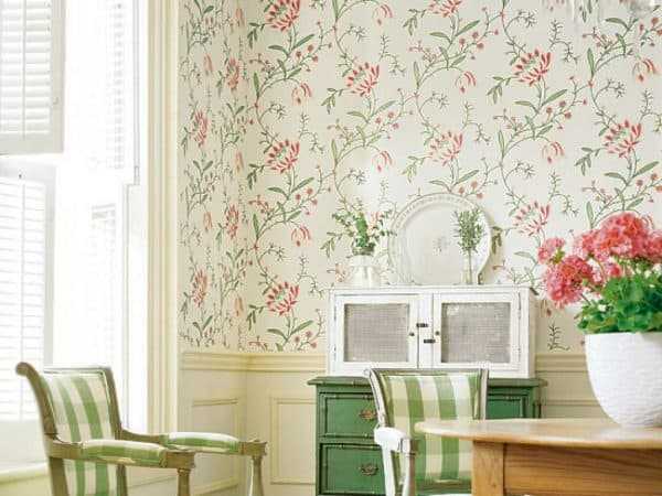 Поскольку в этом стиле предполагается использование устаревшей и вышедшей из моды мебели, с обшарпанными краями и дверцами, то украшение обстановки нужно отдать обоям – они должны быть исключительно мягких и незатейливых расцветок, с мелким цветочным принтом, чтобы создать романтику французской деревенской жизни в настроении домочадцев.
