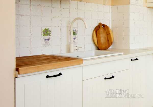 Для кухни прованс подойдет столешница из массива дерева или искусственного камня (акрилового или агломерата). Можно отделать рабочую поверхность керамической или керамогранитной плиткой небольшого формата. Если кухня недорогая, подберите пластиковую столешницу с декором под дерево или камень или столешницу из ДСП с натуральным шпоном.