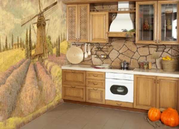 Обои – популярнейший, относительно недорогой вариант покрытия стен. Оригинальные фотообои в интерьере кухни допустимо использовать в качестве яркого акцента, сочетая с другими отделочными материалами.