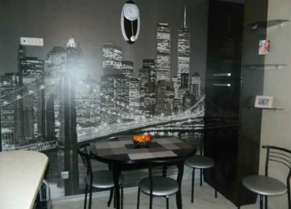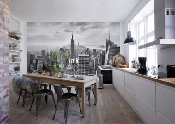 Черно-белые обои с городским пейзажем в интерьере кухни