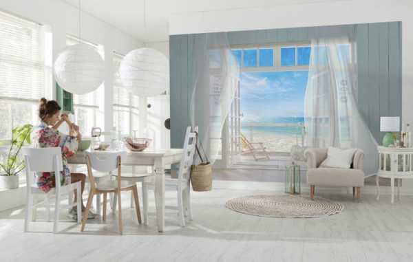 В отделке небольшой гостиной использованы фотообои с умиротворяющим морским пейзажем