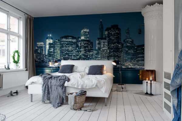 Спальня выглядит стильно и современно благодаря фотообоям с видом на ночной город
