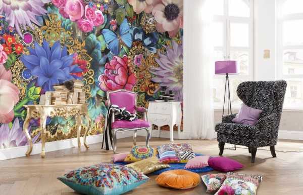 Яркие фотообои в интерьере гостиной будут радовать глаз и создавать праздничное настроение