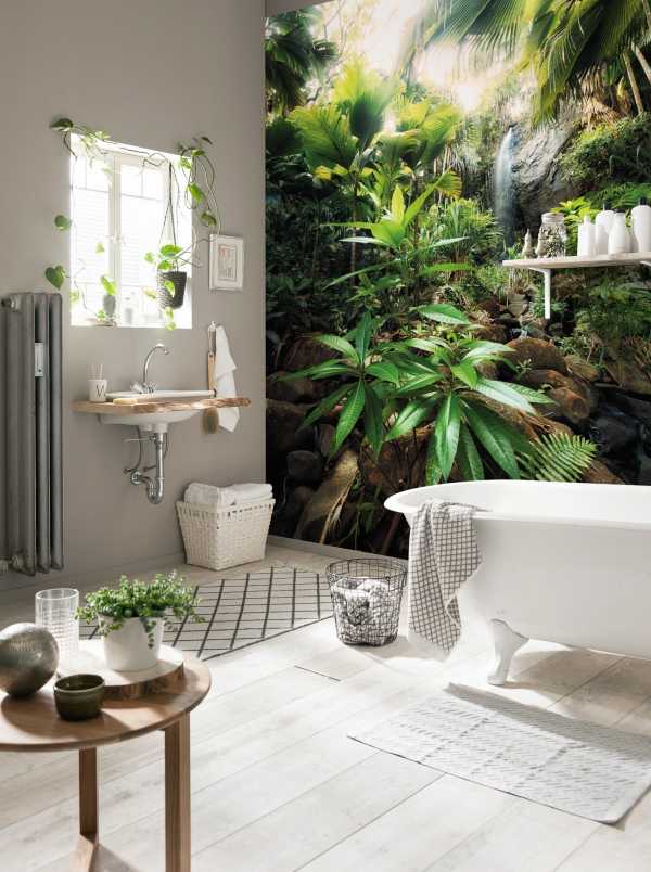 Специальные влагостойкие фотообои можно использовать для отделки стен ванной комнаты