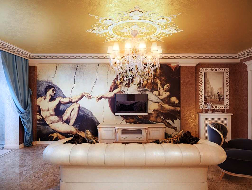 - Репродукции картин, фрески, настенная живопись в тосканском стиле – замечательный выбор для гостиной в классическом стиле. Изысканно и роскошно. Такие фотообои потребуют должного «аккомпанемента» и большой по площади гостиной с высокими потолками.