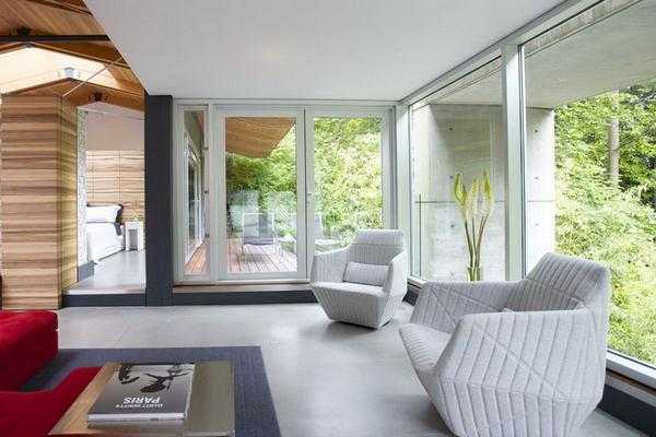 Стена из прозрачного стекла стирает границы между комнатой и участком, прилегающим к дому