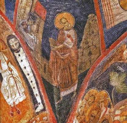 Сроки росписи пришлось резко сократить. В наставлениях епископа Нектария рекомендуется не оставлять левкас «без письма» на два часа и не делать перерывов на обед. И все равно окончание работы нередко совпадало с полным высыханием основы. Последние мазки делались яичной темперой, а уже в 18-м веке фрески стали писать масляными красками. Характерно, что фрески Рублева, известного иконописца, а также Феофана Грека, его современника, писались только темперными красками.