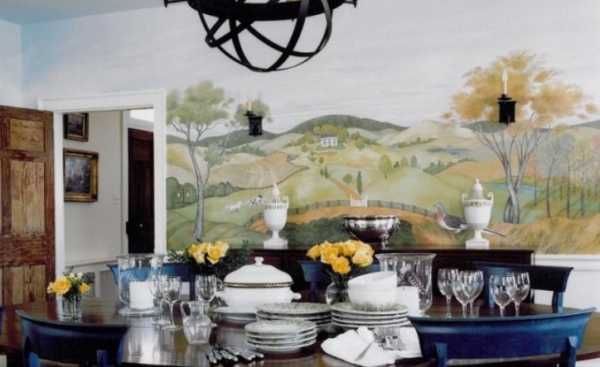 Преимущества провинциального стиля во фресочном или фотографическом оформлении стен, ниш и потолков столовых и кухонь очевидны. Легкая деревенская непринужденность и почти осязаемые ароматы пряностей как нельзя лучше настраивают на спокойный умиротворенный лад, обволакивая сидящих за обеденным столом хозяев теплыми флюидами домашнего очага. Каждый вечер в таком интерьере будет нести отдых и настраивать на добрый душевный разговор, укрепляя семейственность и предрасполагая к доверию.