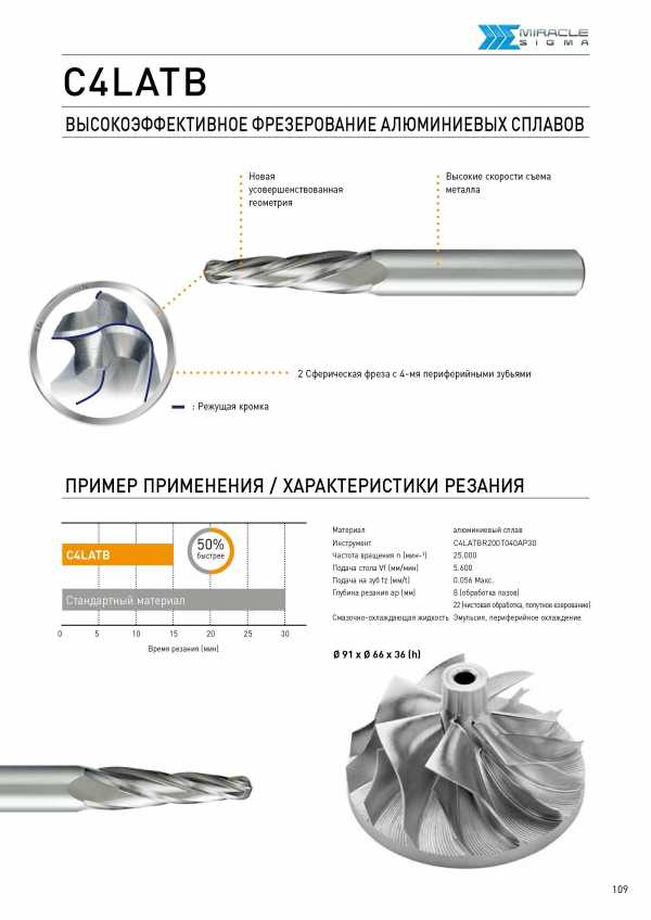 ![]() Конические концевые цельные фрезы Mitsubishi C4LATB (морковки) Общий вид японской фрезы для фрезерования алюминия и алюминиевых сплавов Основные конст Конические концевые цельные фрезы Mitsubishi C4LATB (морковки) Общий вид японской фрезы для фрезерования алюминия и алюминиевых сплавов Основные конструктивные особенности Новая усовершенствованная геометрия Высокие скорости съема металла Режущая кромка 2 Сферическая фреза с 4-мя периферийными зубьями ПРИМЕР ПРИМЕНЕНИЯ / ХАРАКТЕРИСТИКИ РЕЗАНИЯ 10 15 20 Время резания (мин) 25 30 Материал Инструмент Частота вращения n (мин-1 Подача стола Vf (мм/мин Подача на зуб fz (мм/t Глубина резания ap (мм алюминиевыи сплав C4LATBR200T040AP30 25.000 5.600 0.056 Макс. 8 (обработка пазов 22 (чистовая обработка, попутное езерование Смазочно-охлаждающая жидкость Эмульсия, периферийное охлаждение 0 91 x 0 66 x 36 (h) 0 5 109 MIRACLE I G Г\Л A C4LATB ВЫСОКОЭФФЕКТИВНОЕ ФРЕЗЕРОВАНИЕ АЛЮМИНИЕВЫХ СПЛАВОВ | ||||||||