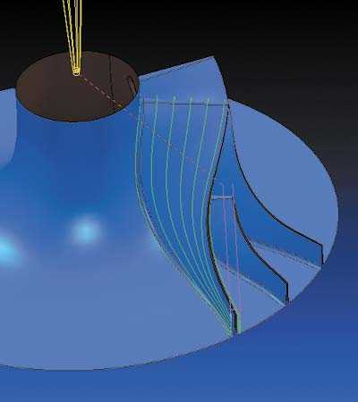 Чистовая обработка дна происходит по тому же принципу, что и черновая, но с меньшим шагом. Предварительно в программе PowerSHAPE эквидистантно ступице создаются справочные поверхности, ограниченные поверхностью лопаток с учетом половины диаметра фрезы и припуска на обработку. Созданные справочные поверхности используются в качестве границ для траектории перемещения инструмента. Затем для каждой из справочных поверхностей создаются кривые, которые, так же как и справочные поверхности, экспортируются через программу PSExchange (рис. 3).