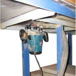 Ручной фрезер закрепляют строго перпендикулярно по отношению к столешнице. Лист фрезера организовывается с помощью штатного устройства. Можно также изготовить специальные приспособления, которые способствуют минимизированию времени и усилий по изменению угла наклона и глубины агрегата.