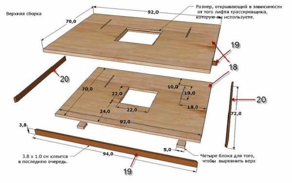 Начать следует с изготовления столешницы и станины, которые могут быть сделаны из древесины, например, из листа фанеры, разрезанной на части. Затем строго перпендикулярно столешнице устанавливается фрезер.