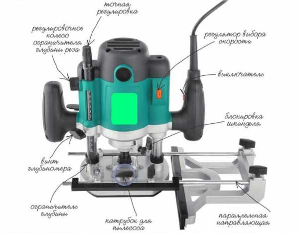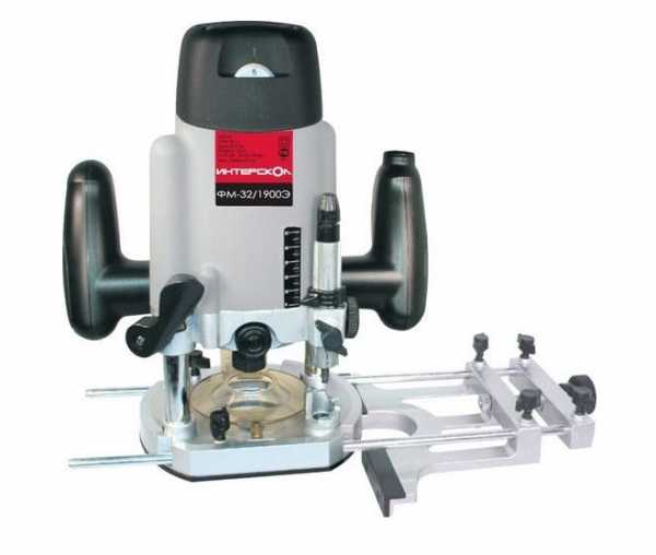 Фреза вращается за счет вращения движка, а тот в свою очередь приводится в действие электричеством.Станок удобно держать за счет специальных ручек. Упор ведется на пластину, которая прикреплена к станку снизу.