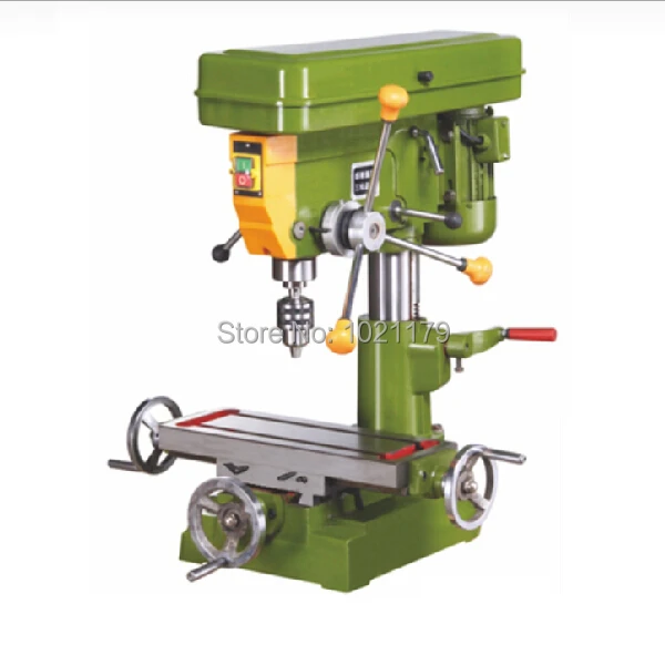 - Особенности: два отдельных двигателя, встроенные тиски, закаленные и отшлифованные направляющие станины, регулируемая фрезерная/сверлильная головка, Т-образные пазы в поперечных салазках