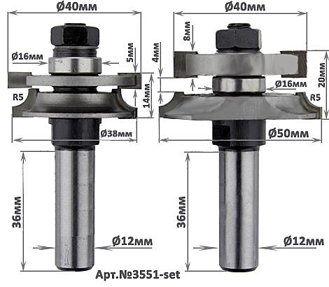 Комплект поставляется в двух конфигурациях. Первая версия — с хвостовиком 8 мм. Второй — с хвостовиком 12 мм. Это было сделано с целью работы как на фрезерных станках малой мощности, так и на более мощном оборудовании — фрезерных станках. Конструкция разборная. Можно ослабить гайку крепления и снять комплектующие, заменить подшипник или заточить ножи. Ножи твердосплавные, сплав ВК8. Припаян к валу латунью.