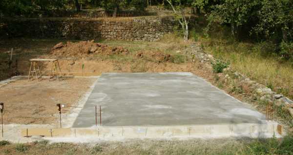 Для обустройства монолитного фундамента по периметру намеченной застройки выкапывают неглубокую траншею и устанавливают опалубку. Вначале делают подушку из песка и гравия, утрамбовывают ее. Затем армируют основание двумя сетками металлических прутьев, подготавливая площадку, и заливают ее бетоном. После этого фундаменту необходимо дать выстояться около 3 недель.