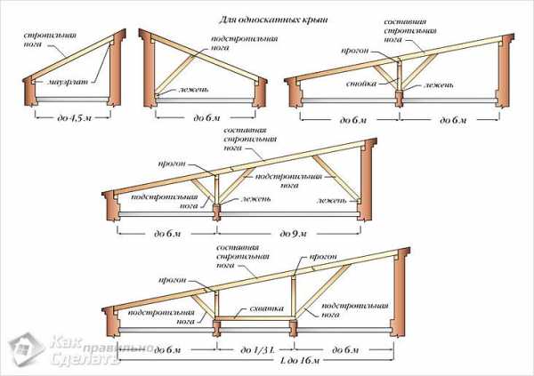 Конструкция стропильной системыСтропила устанавливаются по балкам чердачной поверхности, которые крепятся в специально врезанных в верхней обвязке пазах. Для гаража, подойдёт двускатный тип крыши, так как под неё можно подвести дополнительные сооружения.