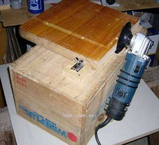 Размеры не указываем, конструкции и размеры болгарок разные. Фото показывают суть устройства, а собрать его несложно. Стоит поработать над креплением болгарки к станине — чтобы она быстро и надежно закреплялась и быстро снималась. Особенно ценно такое приспособление для болгарок с регулировкой количества оборотов.