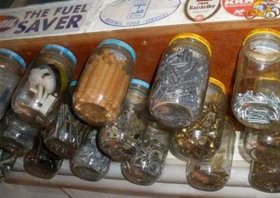 Разная мелочь часто сложена в пластиковых ведрышках и коробочках в виде своеобразного ассорти. Поэтому найти нужный мелкий инструмент, сверло или гайку довольно проблематично. Для хранения мелочей отлично подойдут баночки от горчицы, майонеза и прочих продуктов с металлической или пластиковой крышкой, которая прочно крепится к банке.