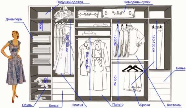 Пример организации пространства в гардеробной комнате (с указанием минимальных размеров для разных видов одежды)
