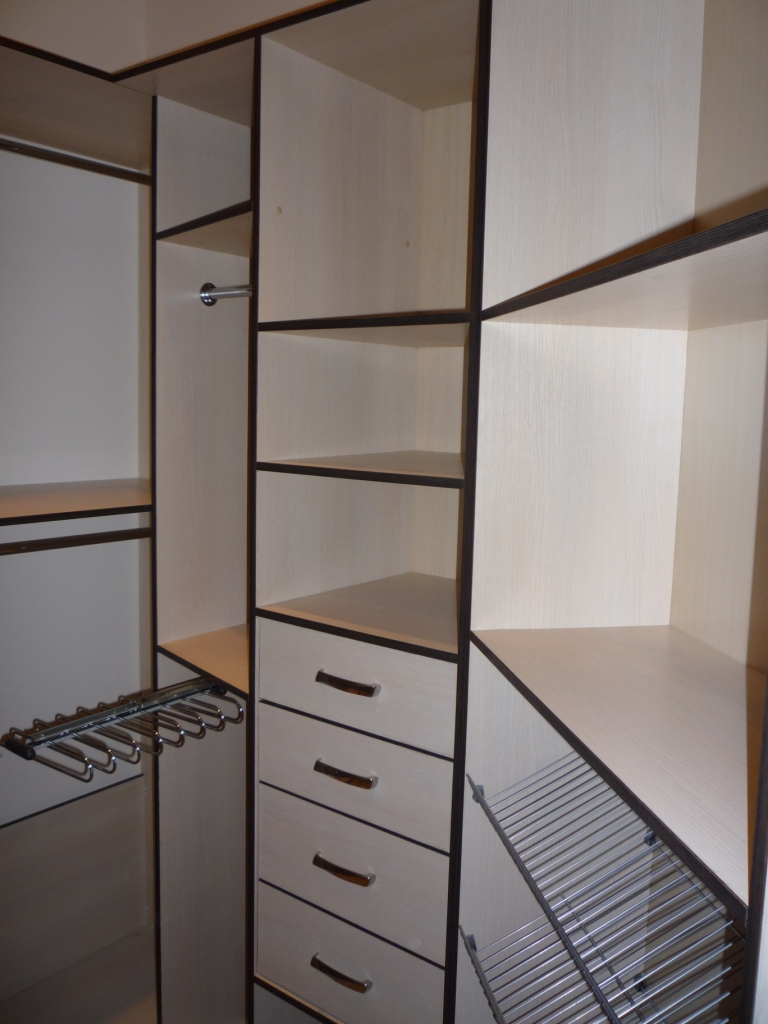 На такой маленькой части пространства от квартиры или комнаты разместится только несколько полок, где будут, к примеру, храниться свитера, майки, штаны, пижама. Дополнительно оборудуются полочки для белья.