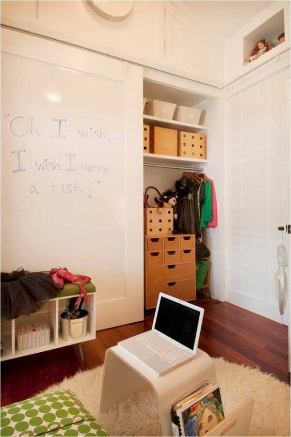 Вместо меловой доски дверь гардеробной может быть облицована покрытием типа «пиши-стирай». Оставляйте сообщения близким и рисуйте в своё удовольствие.